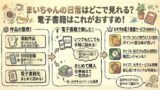 それに、電子書籍サービスなら初回クーポンとかキャンペーンを使えば、紙で買うより断然安く読めちゃうしね。まずは主要なサービスを比較してみたから見てみて!