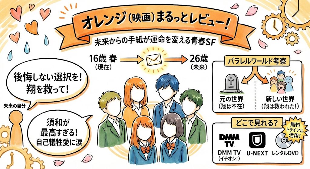 今回は、この『orange』のあらすじからネタバレ、結末の考察、そして「翔(かける)は結局どうなるの!?」ってところまで、ガッツリ10,000文字超えで深掘りしていくよ!まだ見てない人はもちろん、見たことある人も新しい発見があるかも?