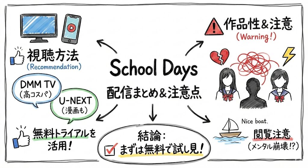 それに、違法サイトで見るのはクリエイターにお金が入らないから、アニメ業界にとってもマイナスなんだよね。スクールデイズみたいな名作(迷作?)を作ってくれた人たちに敬意を払って、ちゃんとした公式サービスで見よう。無料トライアルを使えば、合法的にタダで見れるんだから、リスクを冒す必要なんてないじゃん?