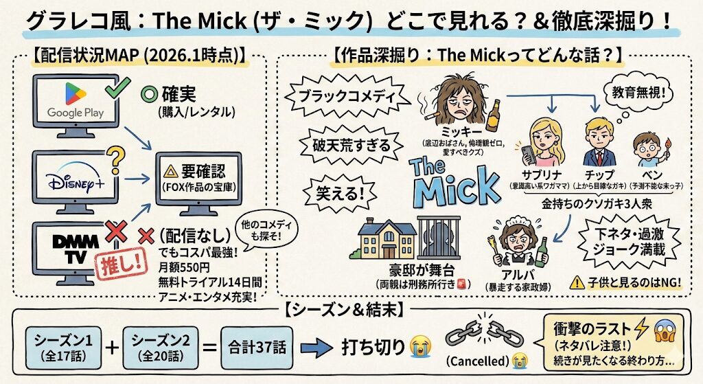 でもね、もしあなたが「The Mick」みたいなブラックコメディやアニメ、エンタメ全般が好きなら、私が今一番推してるのは間違いなくDMM TVなの!✨